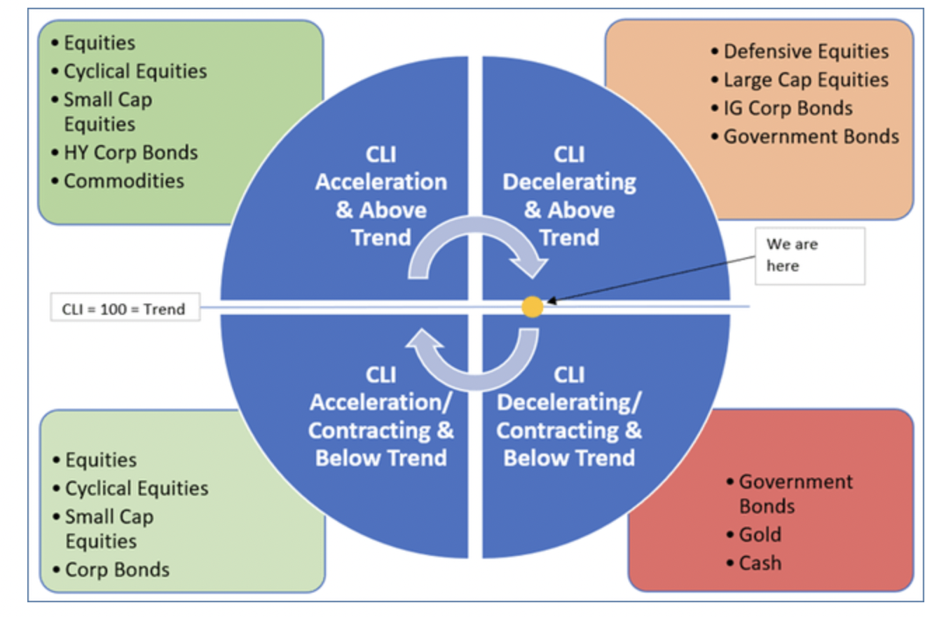 尼尔·迈克尔根据经合组织CLI创建的投资时钟显示,美国目前处于趋势经济活动和经济增长停滞之间的边界,并在风险资产表现不佳时走向收缩区域。