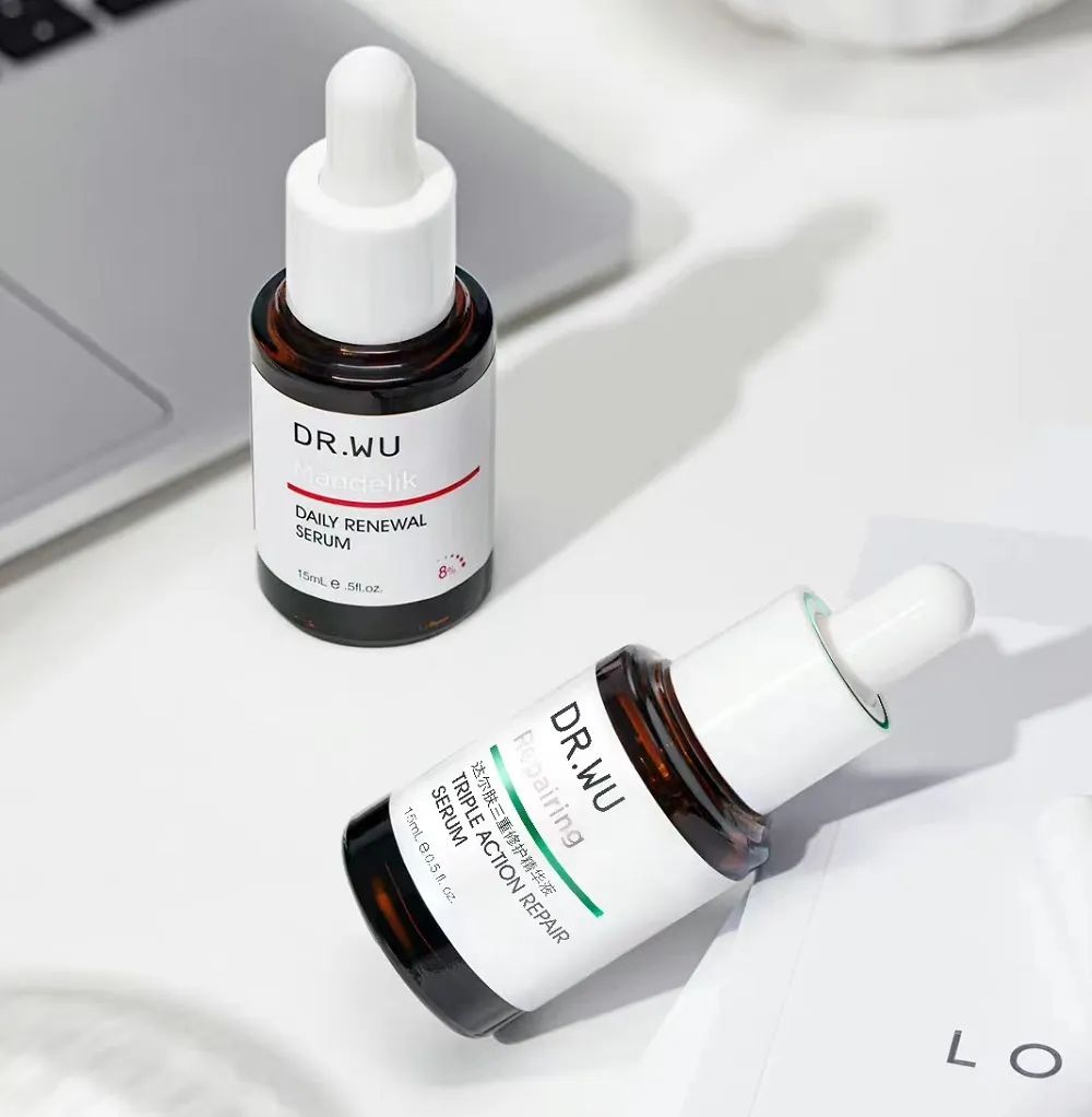 护肤品牌DR.WU达尔肤曾推出主打6%、8%两种浓度的杏仁酸精华,用于改善闭口、痘痘等问题。其中复配了2%水杨酸+1%焦葡酸,这三种酸同时具备了水溶性和油溶性,能够更好地在配方中分布。此外产品还复配了维生素B5、红没药醇等舒缓成分,中和配方刺激性。