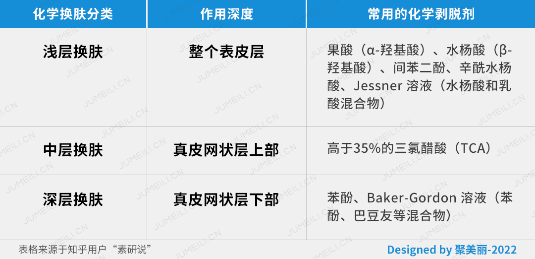 诸如TCA、AHA等“酸”类成分被称为化学剥脱剂,其可以对角质层细胞、表皮细胞造成破坏,去除皮肤的多余角质层、促进表皮层细胞的更替以及真皮胶原再生。根据使用化学剥脱剂作用于皮肤的深度,化学换肤可分为三种:浅层换肤、中层换肤、深层换肤。