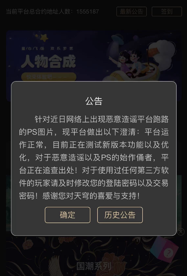 6月6日,针对网传有“出于人道主义发个最后的公告,很遗憾经营不当跑路。各位韭菜们好自为之吧,感谢各位一个月的付出。已经财富自由各位为后会有期漂亮国见-天穹管理组宣”字样的图片,“天穹”数字藏品平台APP澄清,该图片系PS。