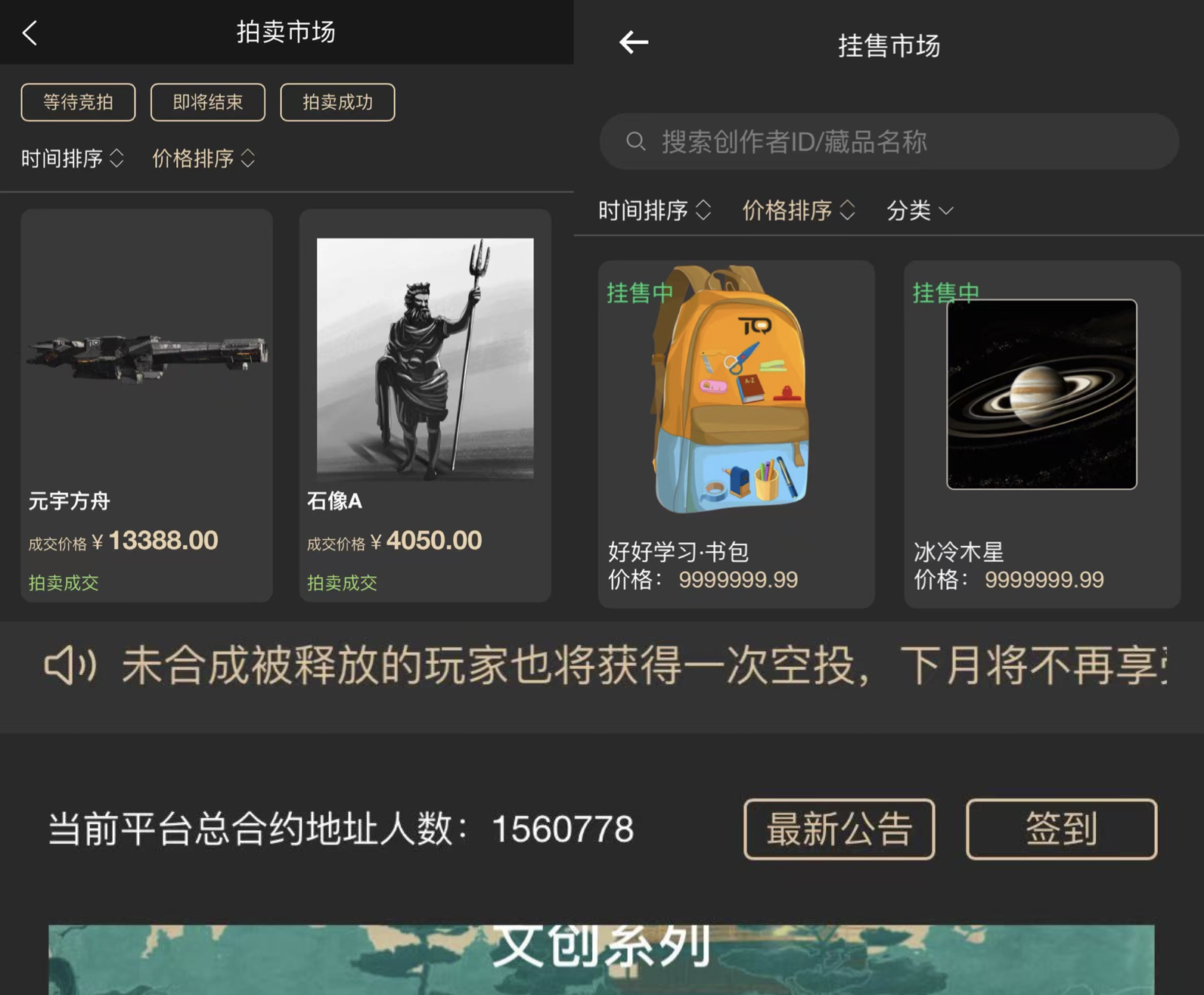“天穹”应用显示,在拍卖市场,过往成交额最高的数字藏品价格达到1.3万元;目前挂售的数字藏品最高价可达999万元,同时也不乏个位数价格的物品。挂售市场买家需进行实名认证。此外,截至7日,平台显示总合约地址人数达到156万。