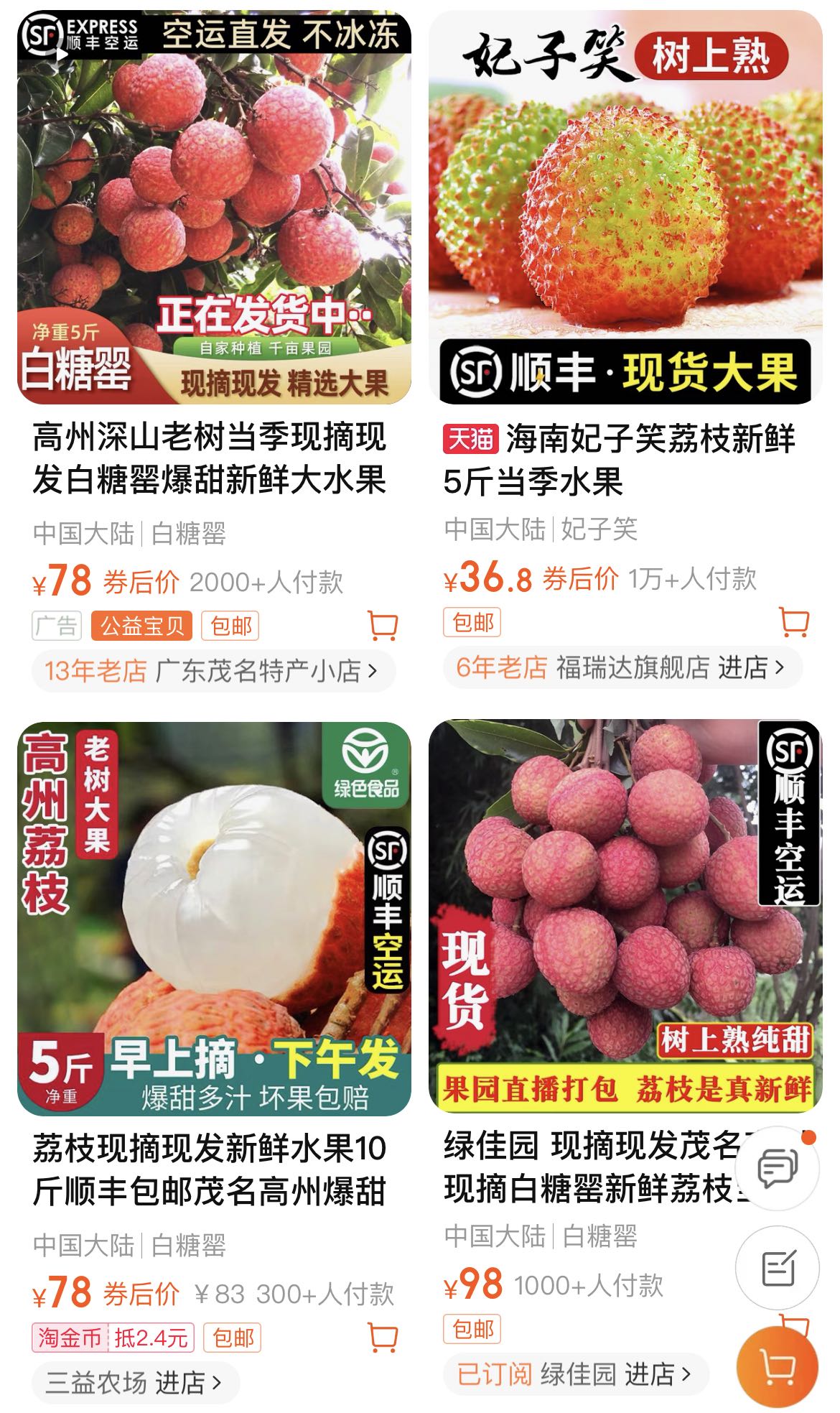 在一定程度上,荔枝运输时效成为商家揽客的因素之一。界面新闻记者在淘宝等电商平台上看到,诸多售卖荔枝的商家都在其商品宣传图上标注着“顺丰空运”的字眼,这样的内容能够给消费者传递出时效保证的信息,从而吸引消费者购买。
