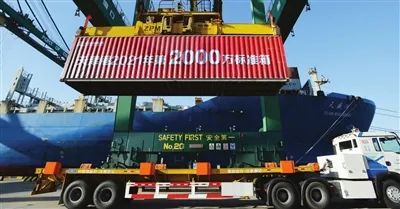 2021年12月18日,随着中远海运“天盛河”轮一个集装箱吊装上船,天津港年集装箱吞吐量首次突破2000万标准箱。(资料照片)