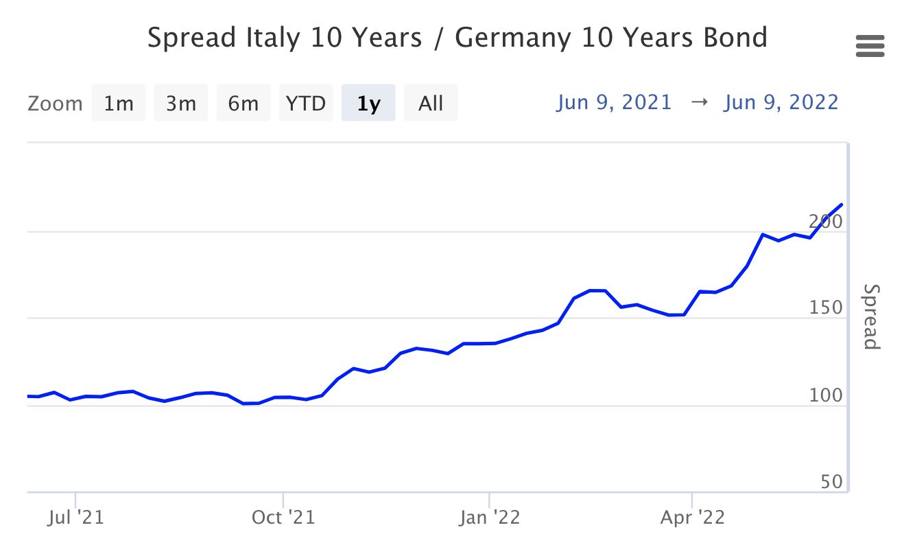 制约欧洲央行跟随美联储大幅度加息的因素之一,便是欧元区各成员国之间的借贷成本差异正在逐步扩大。