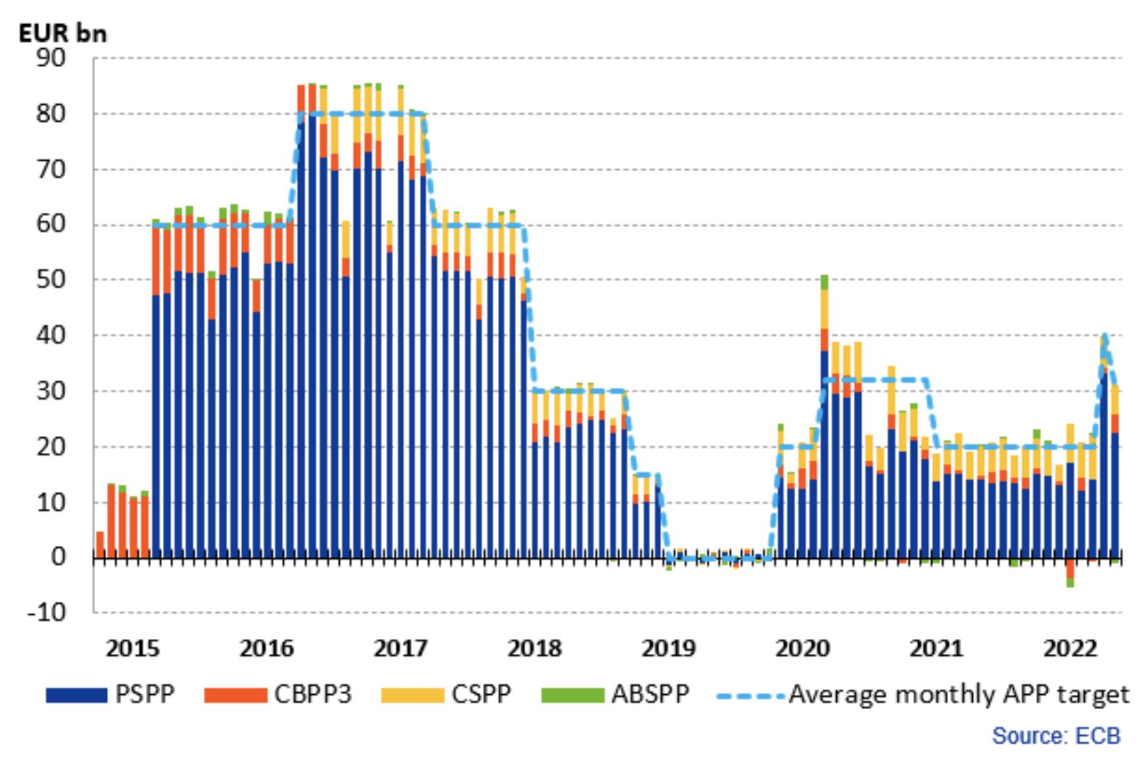 为了给7月的加息铺平道路,欧洲央行还在决议之中宣布将提前于7月1日结束“资产购买计划”(APP,即Asset Purchase Programme)。过去六年内,欧洲央行一直通过APP每月购买约200亿欧元的债券向市场注入流动性。此前外界普遍预计APP将至少持续到第三季度才会被终止。