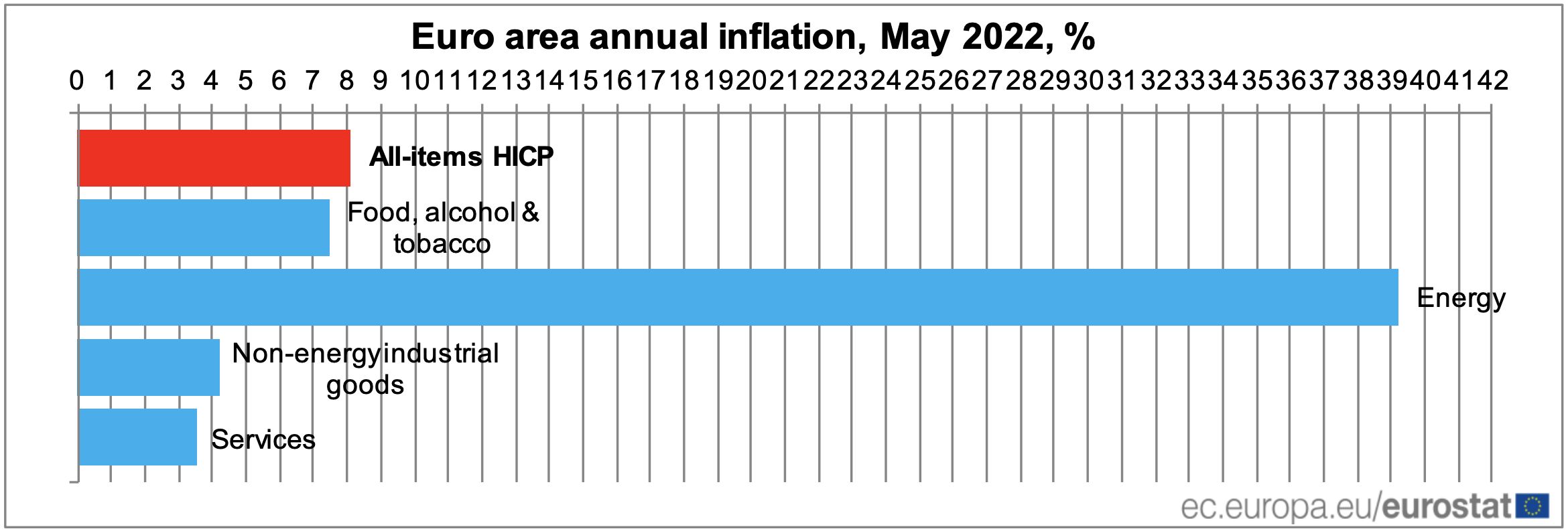 此前5月31日欧盟统计局公布的5月通胀数据显示,欧元区消费者价格指数同比上涨8.1%,不仅超过了4月7.4%的通胀率以及外界预测的7.7%,并再次刷新了欧元区成立以来的纪录,更呈现出通胀加速上升的恶性趋势。