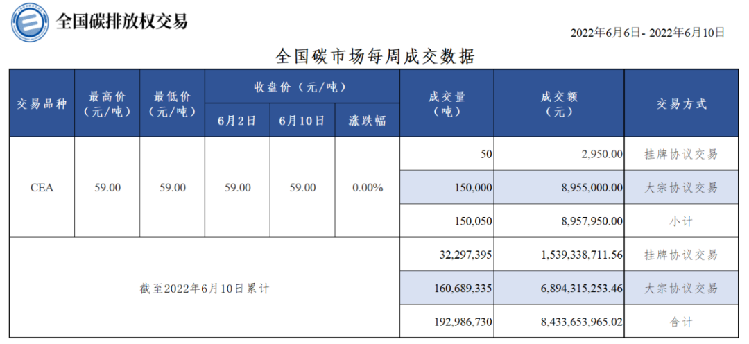 据“全国碳交易”微信公众号10日消息,本周全国碳市场碳排放配额(CEA)总成交量150,050吨,总成交额8,957,950.00元。