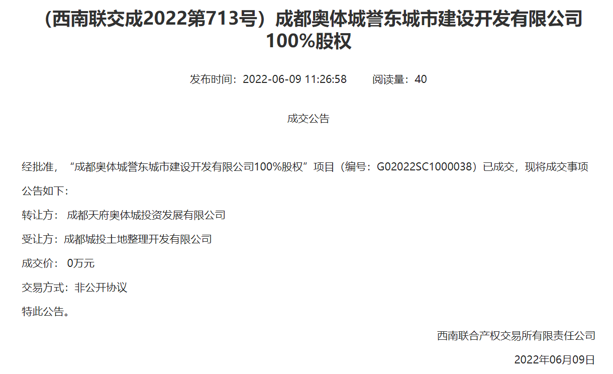 6月9日,据西南联合产权交易所显示,“成都奥体城誉东城市建设开发有限公司100%股权”项目(编号:G02022SC1000038)已成交。