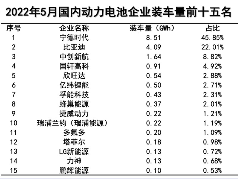 6月10日,中国汽车动力电池产业创新联盟(下称动力电池联盟)发布统计数据,今年5月,宁德时代动力电池装车8.51 GWh,市占率45.85%,较4月上升逾七个百分点,继续蝉联榜首。