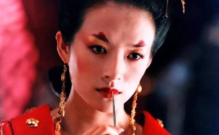 叶锦添为主角设计了属于各自的主题色,章子怡的“婉后”便是红——叶锦添回忆说,因为章子怡皮肤白皙,所以她的妆容都是鲜艳浓重的颜色,配合纯度很高的红色拖地飞凤裙,凸显角色的端庄高贵和华丽。而一丝不苟的盘发、满头琳琅的金穗和布料上的云纹图案则是她权力和野心的表现,整体造型气势十足,如同西式歌剧。另外,当时未到30岁的章子怡要扮演风韵成熟的皇后,加上身材纤小恐难有说服力,于是叶锦添独具匠心把她眉毛剃短,瞬间加强了狠辣果决与凌人的盛气,也使外表多添一份古典。