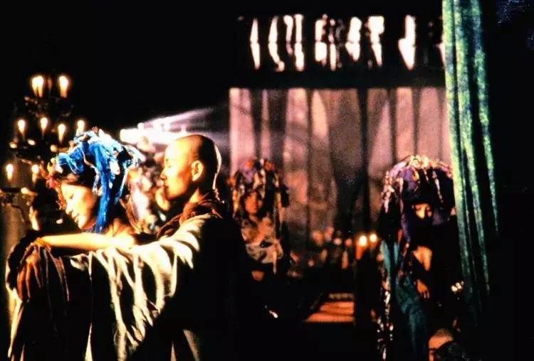 片中,台湾戏剧艺术家吴兴国饰演的男主角石彦生将军剃度后曾与红萼公主在青楼酒肆相会,叶锦添用蓝紫金绿等等色彩庞杂的碎布和纱帐把妓寨布置得十分妖魔化,既贴合唐朝胡汉混居的史实,又用这种肮脏而浓艳的场景衬托横流的欲望,甚至叫人感受到电影大师费里尼作品中的经典元素。此时红萼公主的造型也变成烟花女子一般夸张,周身挂坠着丝缕、亮片和流苏,看得人眼花缭乱,她随性起舞、眼波流转,尽是婀娜性感,石彦生也挥剑助兴,二人和糜烂颓废的背景合为一体,此时石彦生将公主抱起走进幕帘后,波光粼粼的浴池二人忘我缠绵,画面的色调充满暧昧的橘色,仿佛越烧越旺的欲火,这种迷幻的味道被叶锦添悉数营造在风格斑斓浓郁的美术中,叙事几乎可以不必依靠台词,视觉就可推进剧情。