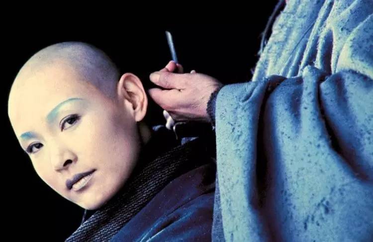 之后李世民当政的朝廷为了灭掉“玄武门之变”的唯一活口石彦生,派出青绶夫人对其诱惑刺杀,陈冲饰演的第二个角色与前半段的公主全然迥异,叶锦添的设计也更偏魔幻,深蓝的长裙、黛色的眼影、乌紫的唇色,仿佛一朵难以捉摸的阴云,神秘、魅惑却又暗藏危险杀机。叶锦添还把陈冲的头发和眉毛剃掉——让一名风姿绰约、女人味十足的女演员以光头的女尼模样出现本就非常奇异,这种突兀的反差强调了青绶夫人狠厉的“禽兽”本色——她出家不为参禅不为求德也不为消灾,只是不择手段达成任务,把勾引和风月当做武器杀人于无形,也点出影片视美色为豺狼的醒世主题。
