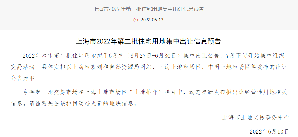6月13日,上海市土地交易事务中心发布公告《上海市2022年第二批住宅用地集中出让信息预告》,该公告表明,2022年上海市第二批住宅用地拟于6月末(6月27日-6月30日)集中出让公告,7月下旬开始集中组织交易活动。