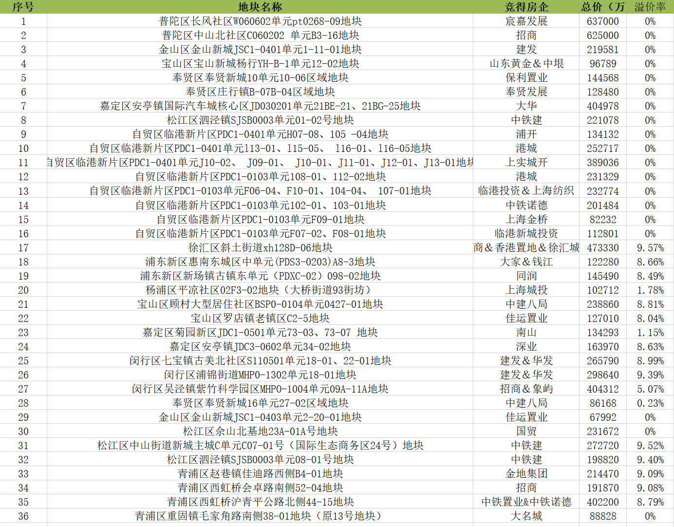 据界面楼市上海了解,上海2022年第一轮土拍集中交易活动从6月1日到6月8日,端午假期顺延,共历时5天,一共出让36块土地,涉及12个区域,合计计容建面425.2万平方米,价格总计约835亿元,合计最少可供应套数约36835套。其中,共19宗土地底价成交,13宗土地达到8%以上的溢价,多家企业拿地不止一幅,招商共拿地4幅。