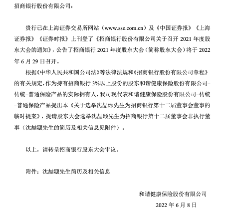 和谐健康称,根据《中华人民共和国公司法》等法律法规和《招商银行股份有限公司章程》的有关规定,作为持有招商银行3%以上股份的股东和谐健康保险股份有限公司-传统-普通保险产品的实际拥有人,我司现代表和谐健康保险股份有限公司-传统-普通保险产品提出本《关于选举沈喆颋先生为招商银行第十二届董事会董事的临时提案》,提请股东大会选举沈喆颋先生为招商银行第十二届董事会非执行董事。