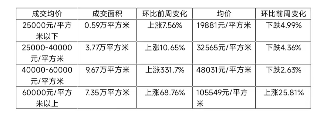 上周上海市商品住宅成交面积为21.39万平方米,环比前周上涨102.71%;上周全市商品住宅成交均价为64298元/平方米,环比前周上涨12.44%。