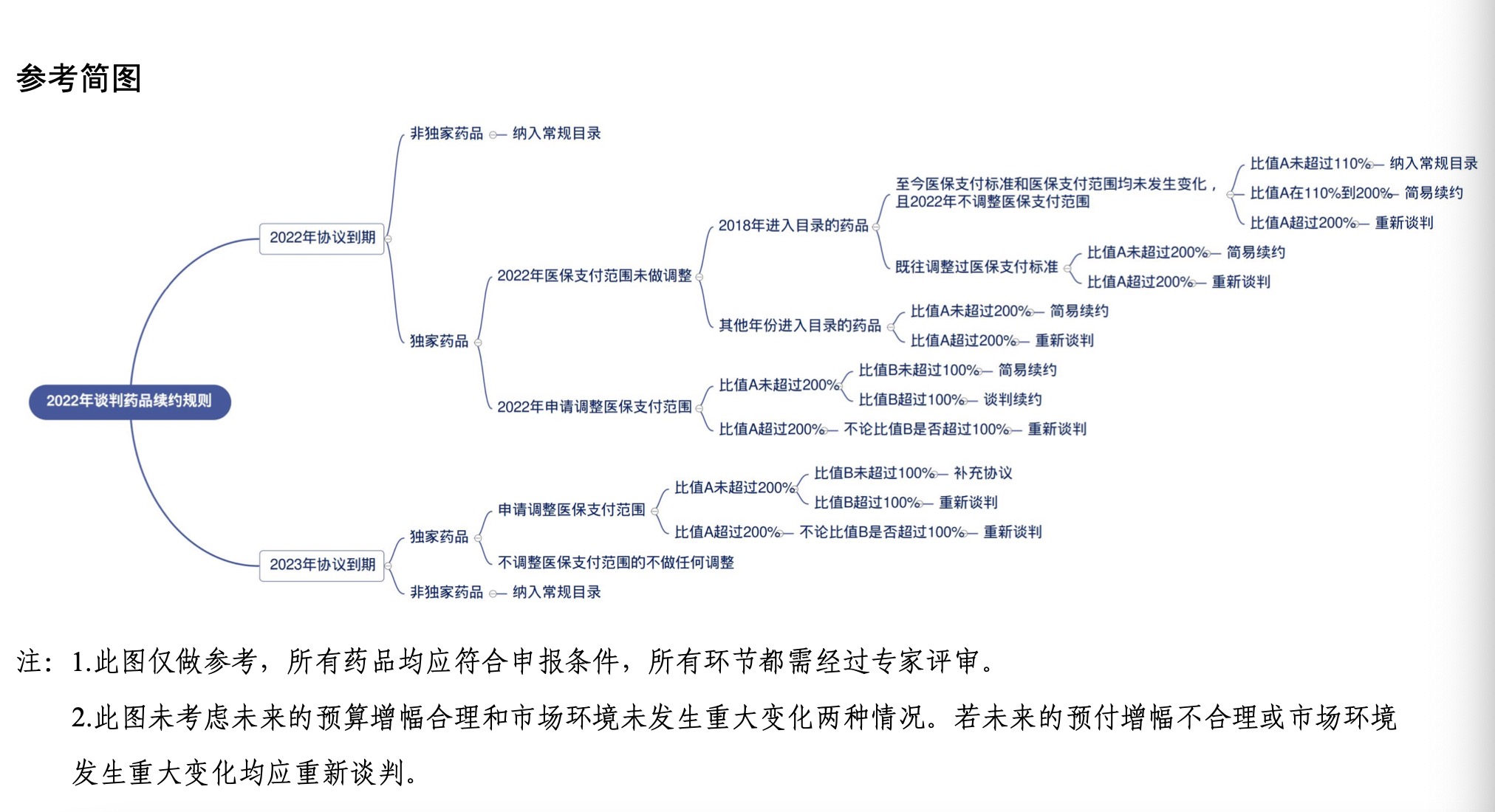 谈判药品续约规则方面,按照《基本医疗保险用药管理暂行办法》和《2022年国家基本医疗保险、工伤保险和生育保险药品目录调整工作方案》有关要求,现分类提出谈判药品(含谈判续约药品)协议到期后的处理规则。