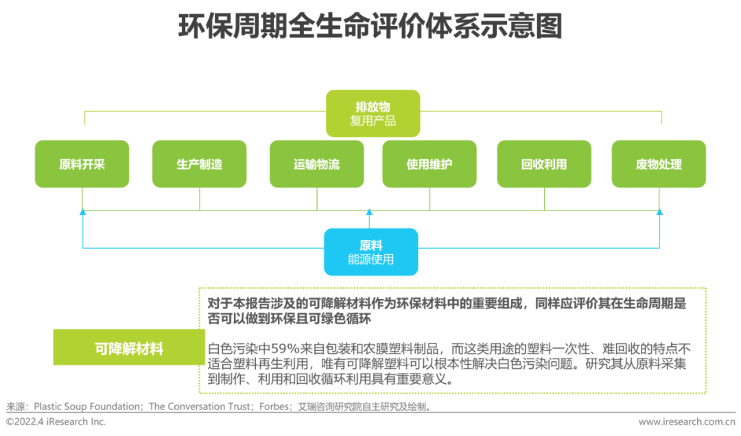原料的来源和使用真正符合合理、绿色的资源消耗;制造环节中可以利用技术生产出友好于环境、人类的无污染产品;运输和使用的过程中材料符合生态健康、人类健康,以及最后环节的回收再利用和废物处理做到真正的回到自然中去良性循环,实现真正的全生命周期体系,切实解决白色污染问题。
