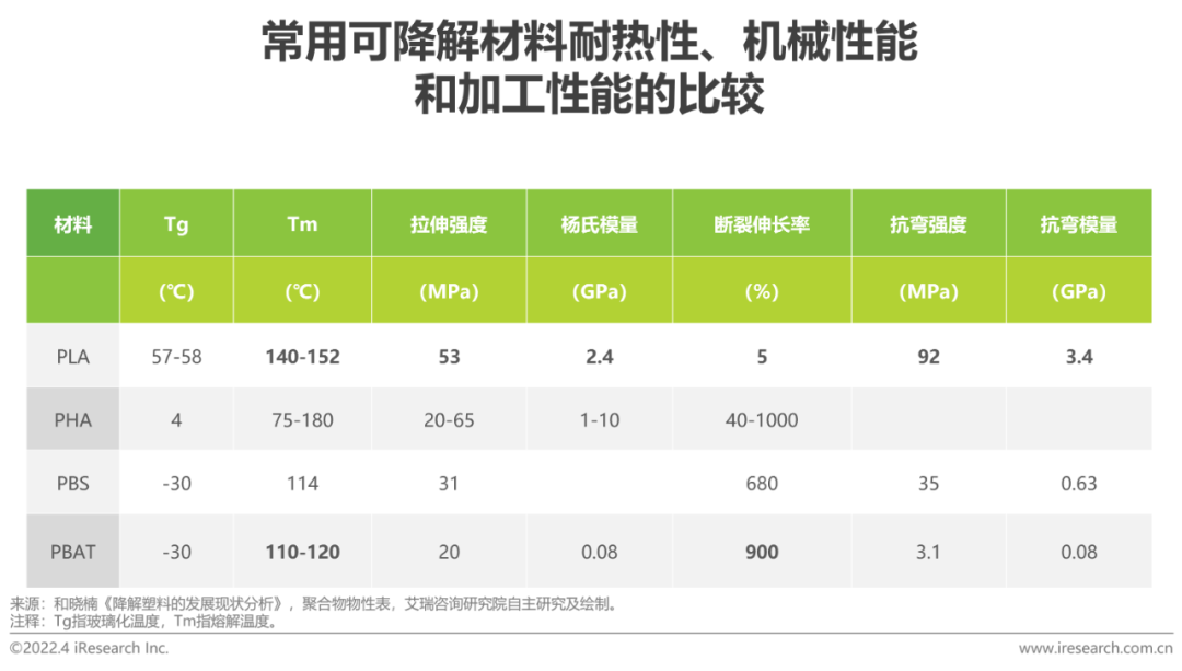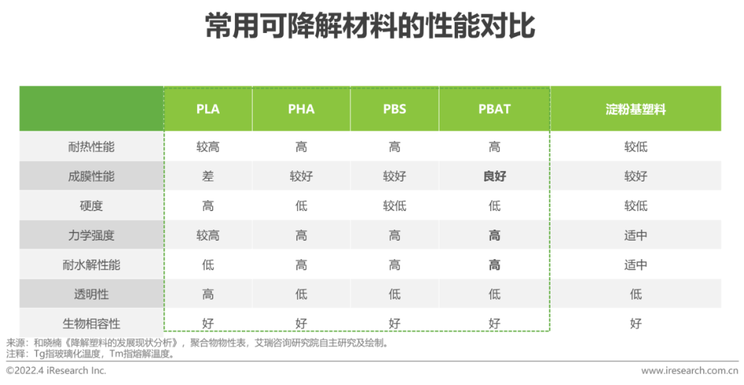 对不同的下游应用(膜、塑料袋、杯具等),要综合考量不同材料的耐热性、机械和加工性能。其中,模量对于材料的软硬影响较大。从制作硬质产品的需求出发,PLA具备较高的硬度和高透明性,是理想的透明容器、管材制造原料,但耐水解性能不佳;从制造软质产品的角度,PBAT兼具PBA(聚己二酸丁二醇酯)和PBT(聚对苯二甲酸丁二醇酯)的特性,性能接近传统石油基塑料,具备较好的延展性和断裂伸长率,成膜性能突出,PBS与其性能接近。PHA具备良好的降解能力,不要求工业堆肥等苛刻条件。综合来看,PBAT、PLA等的性能与普通的日用消费级塑料已经比较接近。