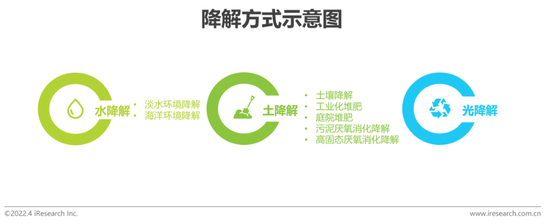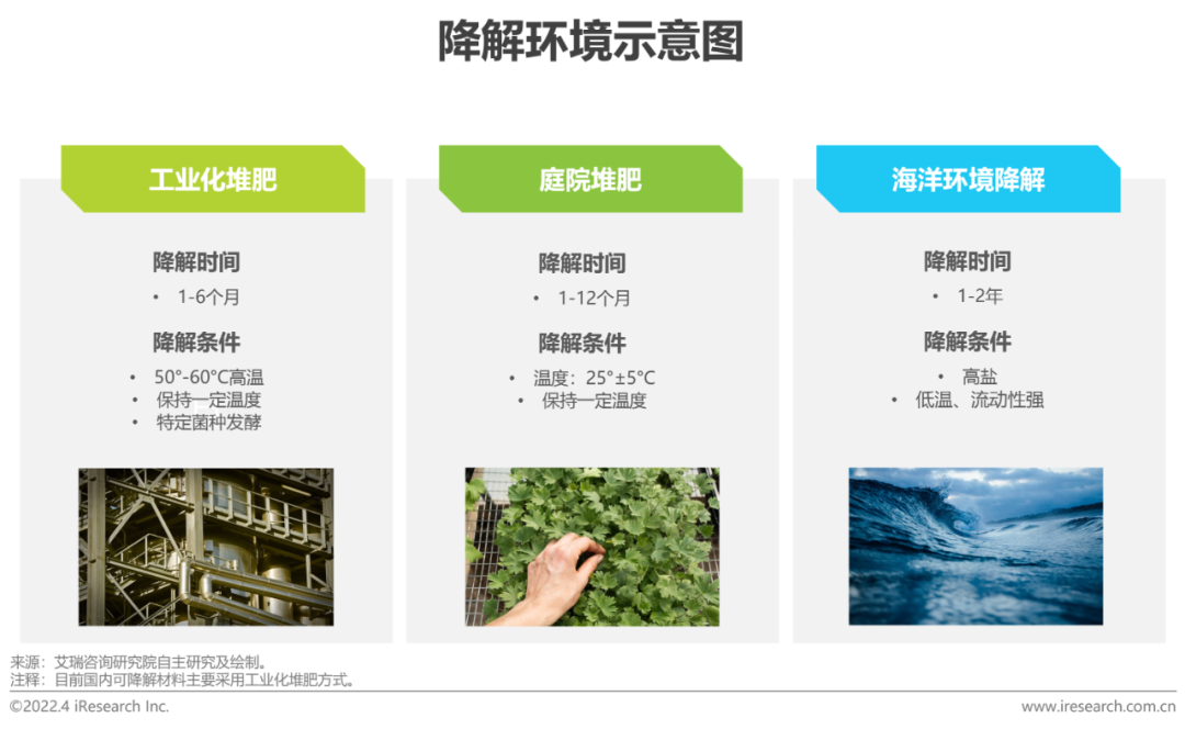 可降解材料并不能在自然界中形成天然闭环,只有满足一定的环境条件才能完全降解。根据外部环境因素进行区分,降解方式主要包括水降解、土降解和光降解,不同方式下的降解时间和条件不同,目前大多数可降解材料需要满足堆肥条件。