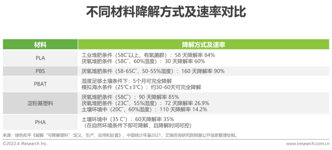 鉴于原料、结构的不同,在不同的环境条件下不同的生物降解材料降解方式及速率存在差异,这影响环保全生命周期的循环实现及长短,进而影响未来不同材料的使用前景。