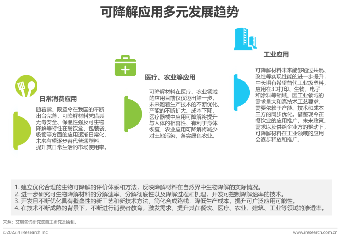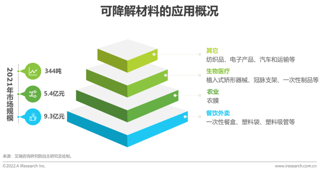 现状:从性能上看,PLA、PBAT、PHA等生物降解塑料性能接近普通塑料,为替代不可降解塑料创造了条件;从技术上看,PLA生产的中间原料丙交酯技术难以完全突破,限制产能释放,而PBAT国内生产工艺不受限于国外,产能快速扩张;从应用上看,可降解塑料主要应用在餐饮、医疗和农业等领域。根据艾瑞测算,至2025年,外卖包装、农膜和医疗领域将会释放可降解塑料需求494.8亿元、72.7亿元和0.172亿元。