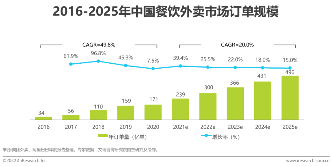 2020年全国餐饮外卖市场总订单量达到171.2亿笔,在疫情的巨大冲击下仍然实现了7.5%的逆势增长;2016-2020年的CAGR为37.8% 。根据美团、阿里巴巴年度报告公布的用户订单量,我们整理得出了过去五年全国外卖订单量,结合增长趋势变化,考虑到近年来增速回落以及市场增长空间的有限性,我们以订单增速平均每年下降3.5%来预估2022-2025年的外卖订单量。