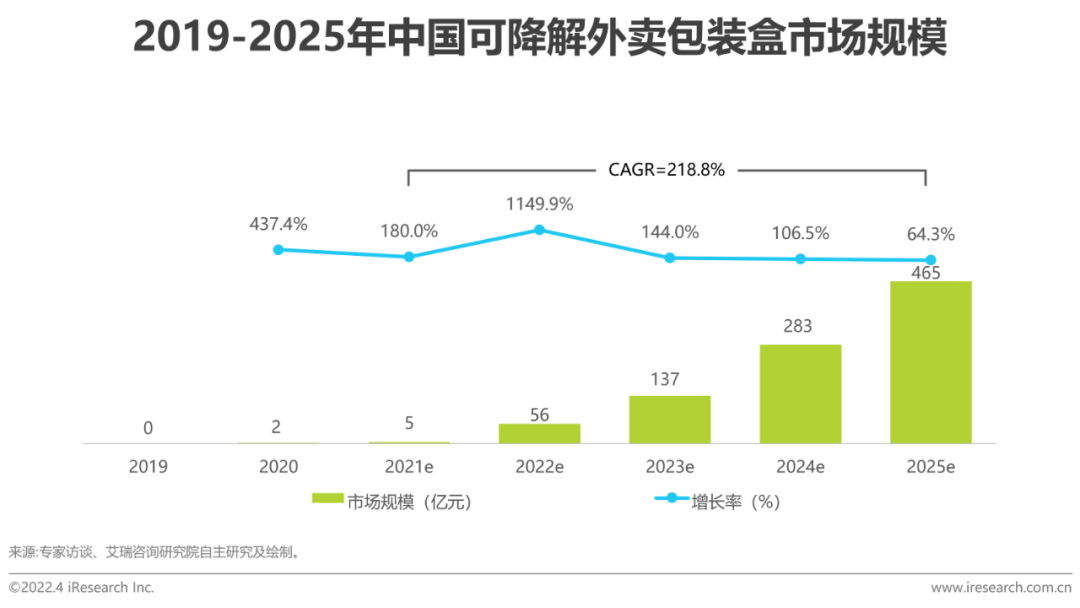 得益于国家产业聚集需求,可降解材料的产能提升,2025年外卖包装袋市场规模有望达29.8亿元,同时可降解外卖包装盒市场规模可达465亿元。