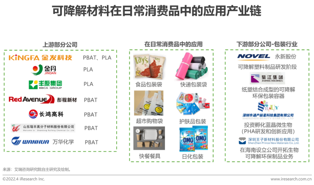 可降解材料 PLA(聚乳酸)和 PBAT(聚己二酸/对苯二甲酸丁二酯)可应用于日常消费品中。在上游,国内已有金发科技、金丹科技等企业已拥有或未来预计拥有PLA/PBAT产能。可降解塑料可应用于食品包装(食品袋、超市购物袋、快餐餐具)、快递包装(塑料包装袋、塑料胶带、一次性塑料编织袋)、化妆品/护肤品包装等多个日常消费领域中。在下游塑料包装行业中,部分头部企业,如永新股份、紫江集团等已着眼于研发生产可降解材料。