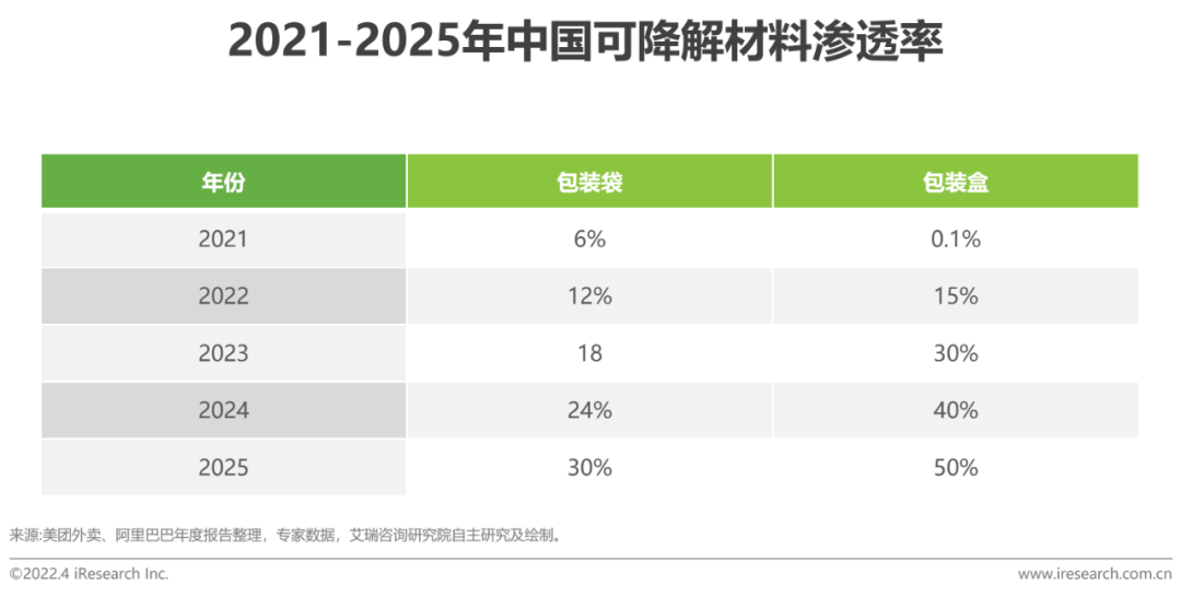 2021年前行业整体的可降解材料渗透率较低,主要受限于可降解材料的产能和成本问题。前期需要依靠政策推动,2020年1月国家发展和改革委员会发布了《关于进一步加强塑料污染治理的意见》,宣布到2020年底全国范围餐饮行业禁止使用不可降解一次性塑料吸管;到2025年,地级以上城市餐饮外卖领域不可降解一次性塑料餐具消耗强度下降30%。2020年下半年,美团外卖与31家降解类包装产品企业达成战略合作,供平台餐饮商户选择,进一步推广了外卖行业可降解材料的应用。