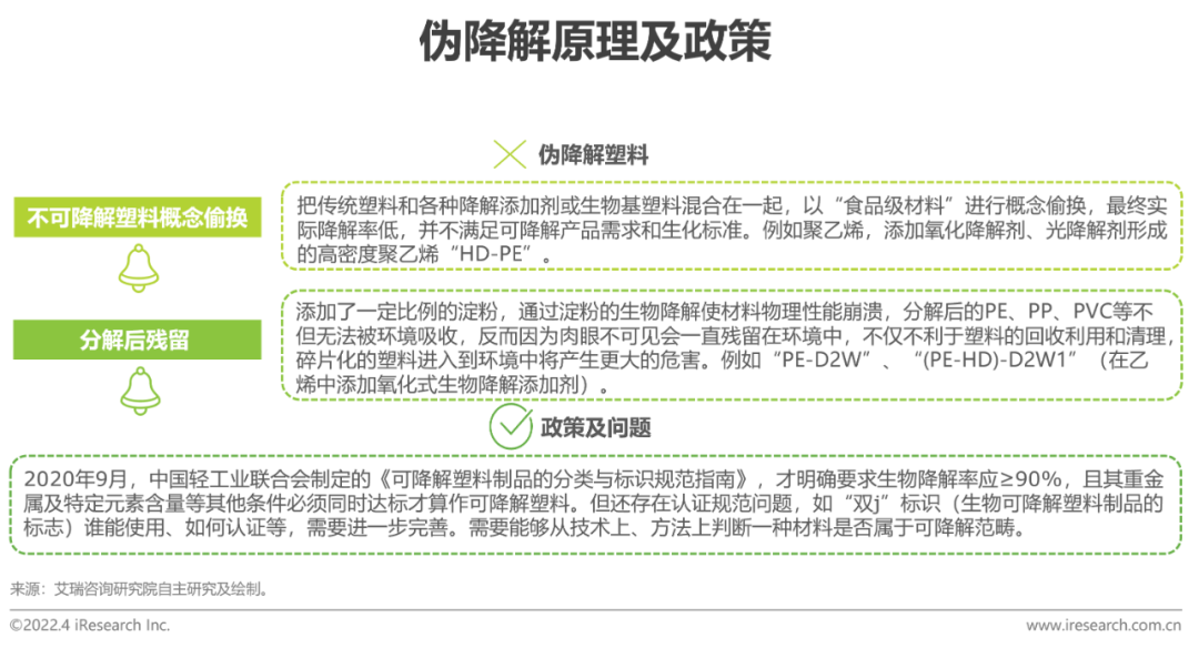 如何判断一种材料是否为可降解?需要看三个指标:相对降解率、最终产生物及重金属含量。有一项不达标,严格意义上都不能算作可降解材料。目前的伪降解塑料主要有概念偷换和分解后残留两大类。产生大量伪降解塑料的主要原因是由于禁塑政策拉动可降解塑料国内需求的稳步增长,目前“禁塑令”仅在塑料吸管上进行全面禁止,国内可降解产能可以覆盖。未来可降解材料在全部餐饮用具上的逐步铺开使用,供需关系暂需逐渐匹配,但标准和监管欠缺。加上真正的-可降解材料价格高,商家受利益驱动,消费者识别能力较弱。