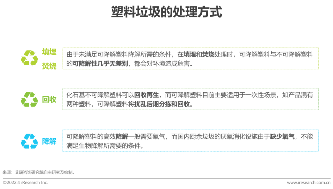 处理塑料垃圾的方式有填埋,焚烧,回收和降解:对于可降解塑料,填埋、焚烧达不到降解条件,此时其与不可降解塑料并无区别,无法解决“白色污染”问题;与可再生塑料不同,目前可降解塑料的一次性应用导致其不适用于回收;可降解塑料大多都依赖堆肥降解,但是若将可降解塑料与湿垃圾一同进行堆肥处理,由于前者的降解速度慢于后者,拖累垃圾处理效率,而将可降解塑料单独堆肥处理又会成本过高。