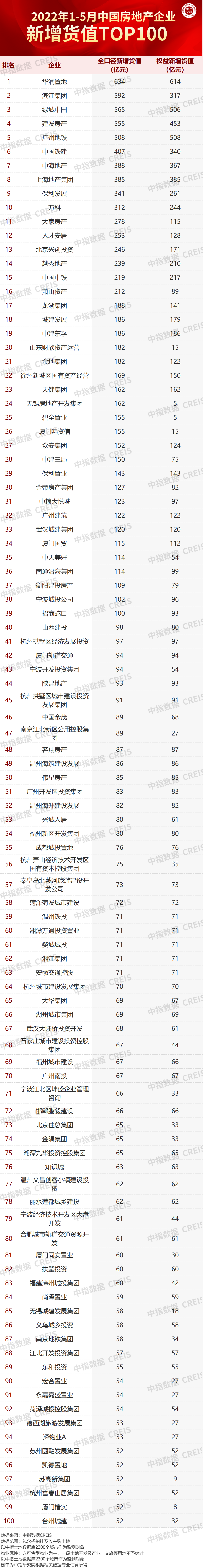 从新增货值来看,华润置地、滨江集团和绿城中国占据榜单前三位。2022年1-5月,华润置地以累计新增货值634亿元占据榜单第一;滨江集团和绿城中国紧随其后,累计新增货值规模分别为592亿元和565亿元。TOP10企业1-5月新增货值总额4686亿元,占TOP100企业的34.3%,新增货值门槛为312亿元。