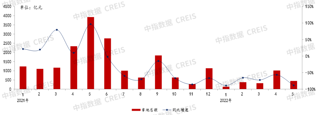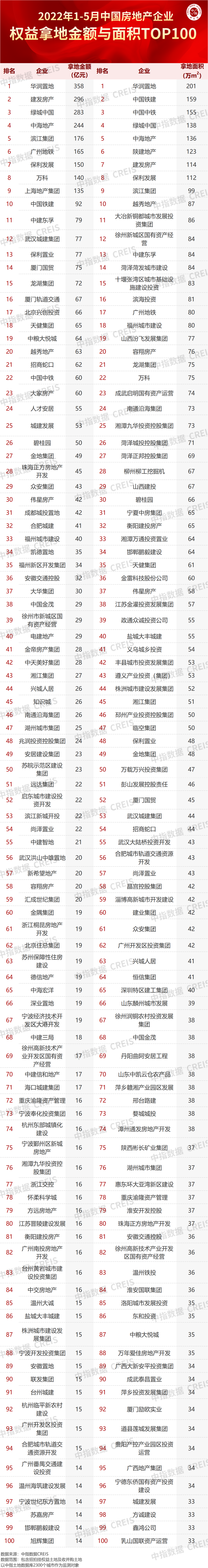 2022年1-5月,TOP100企业拿地总额4681亿元,拿地规模同比下降64.7%,降幅比上月扩大8.8个百分点。TOP100门槛值为14亿元,较2021年5月下降15亿元,TOP100企业招拍挂权益拿地总额占全国300城土地出让金的比例为50.0%。