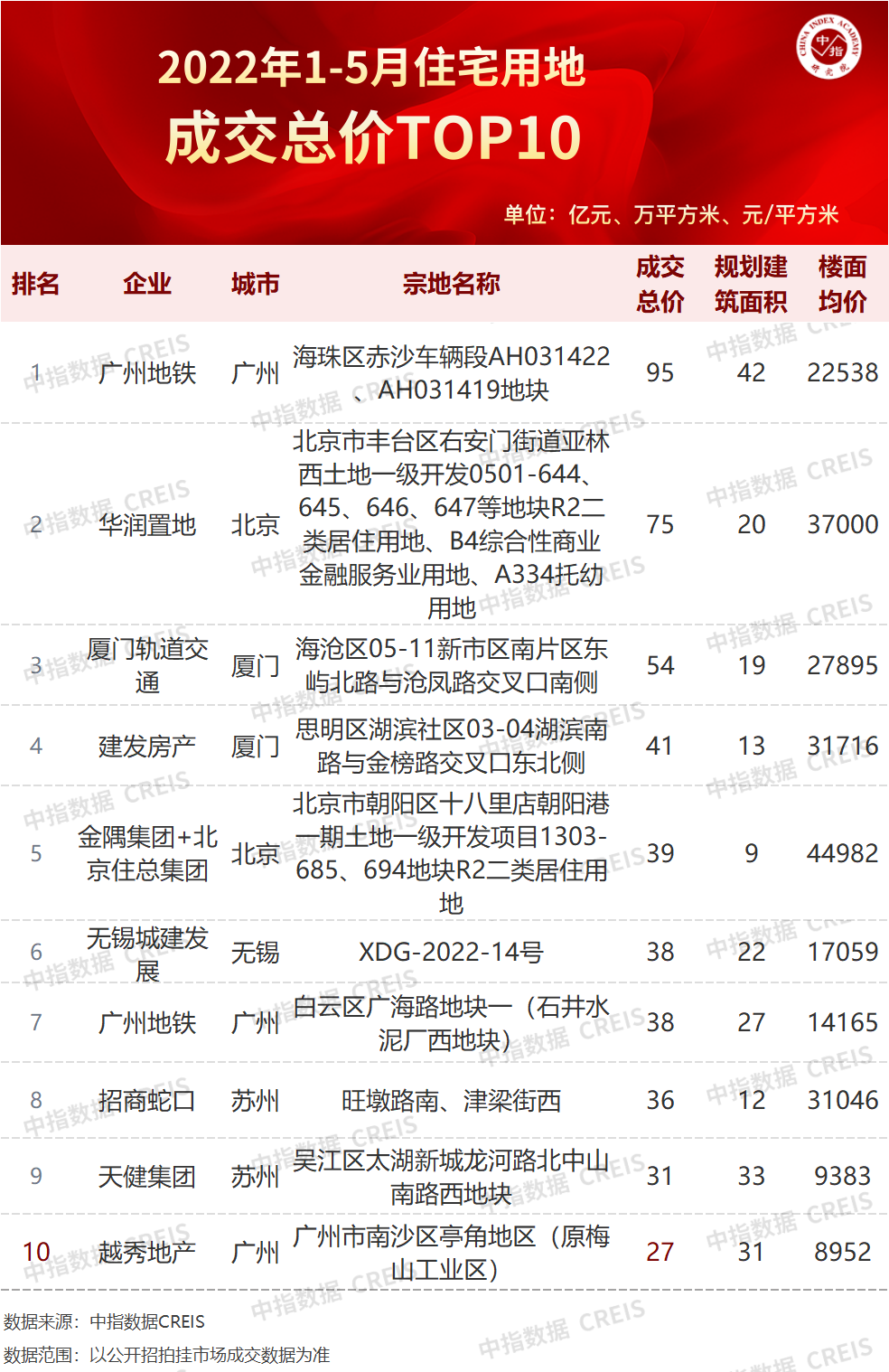 从全国住宅用地成交总价TOP10来看,5月入榜地块中,全部位于重点城市群,成交金额门槛为27亿元。随着多城市完成集中供地,整体来看土拍市场有所回温,但仍以重点城市群为主。其中,海珠区赤沙车辆段AH031422、AH031419地块成交总价最高,为95亿元,建筑规划面积42万平方米,成交楼面均价为22538元/平。