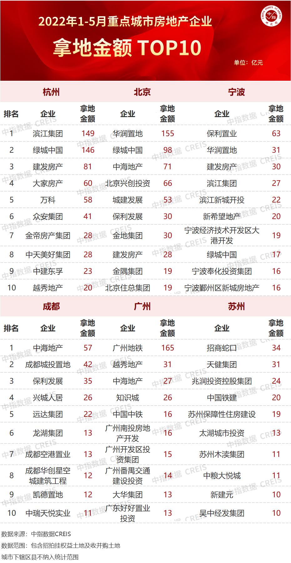 杭州、宁波和北京位列代表房企拿地面积前三城市。2022年1-5月,50家代表房企拿地面积TO10城市中,杭州位列第一,宁波和北京占据二、三位置。其中,杭州以273.6万平方米位列第一,宁波以126.6万平方米位列第二。