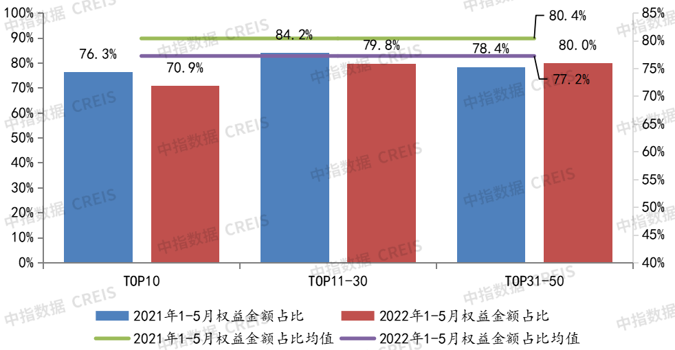 50家代表房企招拍挂拿地权益金额占比均值略有下降。2022年1-5月,50家代表房企招拍挂权益金额占比均值为77.2%,较同期下降3.2个百分点,企业倾向合作拿地。具体来看,与去年同期相比,TOP10阵营企业拿地权益金额占比降幅最大,下降5.5个百分点,TOP11-30阵营企业拿地权益金额占比下降4.3个百分点,TOP31-50阵营企业拿地权益金额占比上升了1.5个百分点。