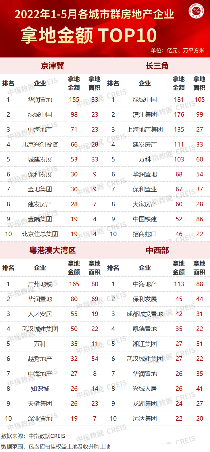 从各城市群拿地金额来看,长三角地区赶超京津冀领跑全国。1-5月,长三角TOP10企业拿地金额999亿元,居四大城市群之首,其中,绿城中国拿地金额为181亿元;京津冀TOP10企业拿地金额569亿元,位列第二;粤港澳大湾区TOP10企业拿地金额515亿元,位列第三。拿地面积来看,长三角TOP10企业拿地面积以551万平方米位居四区域首位,继续领跑。