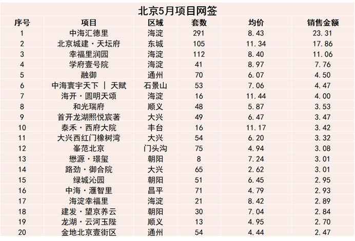 5月份,中海汇德里销售均价8.4万元/平方米,月内网签291套,成交金额23.31亿元,幸福里润园则网签112套,销售均价同样是8.4万元/平方米,网签金额11.06亿元。