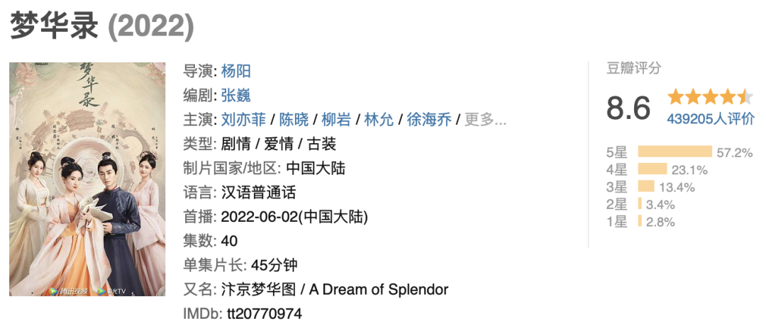 现实也验证了这一点,上线仅三天,《梦华录》即登上云合数据连续剧霸屏榜第一位,且持续领先,豆瓣评分也达到8.7。在腾讯视频的宣传海报上,从最初的“口碑新剧”变到“高口碑新剧”,尽管如今才刚刚六月过半,现在已是“年度最高分国产剧”。