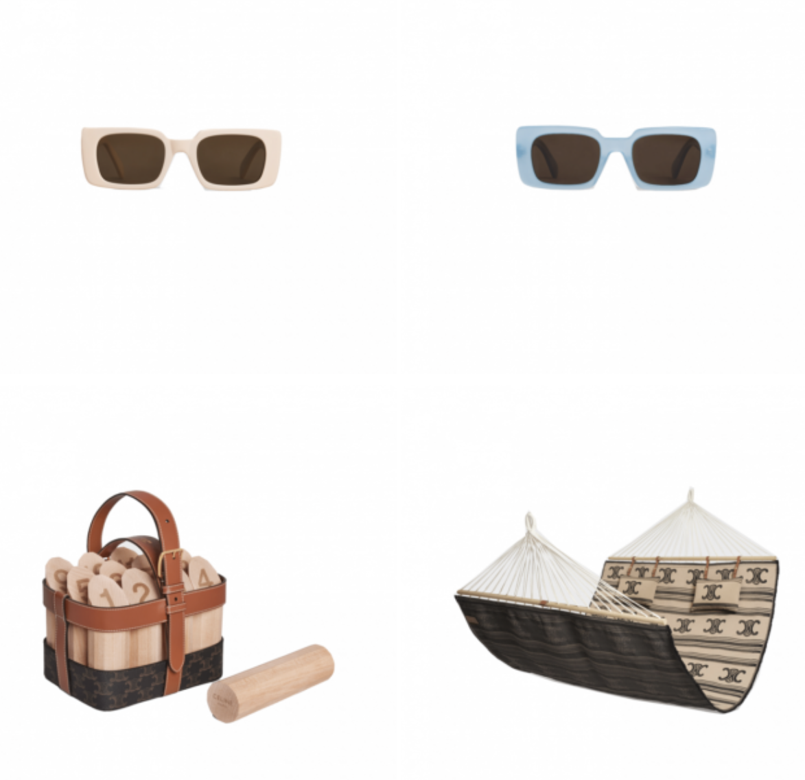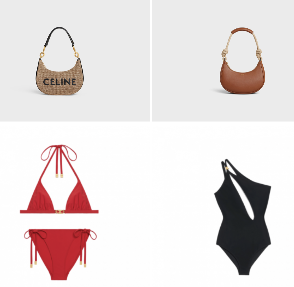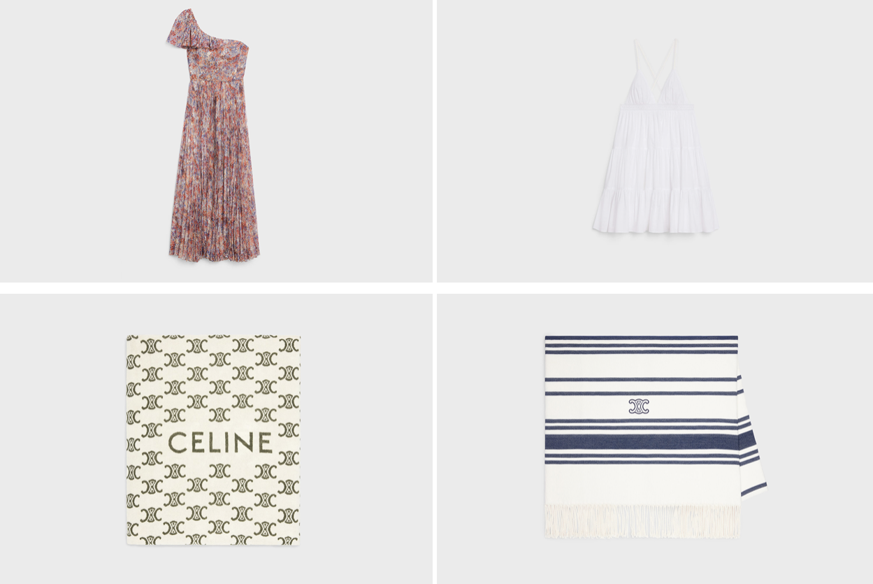 Celine沙滩装胶囊系列“Plein Soleil”中单品种类繁多,几乎囊括了所有夏季服饰样式:度假碎花单肩裙、连体短裤、抹胸上衣、凉鞋、编织包、宽檐遮阳帽,棒球帽,比基尼、编织凉鞋、太阳镜、沙滩巾、运动服等等。