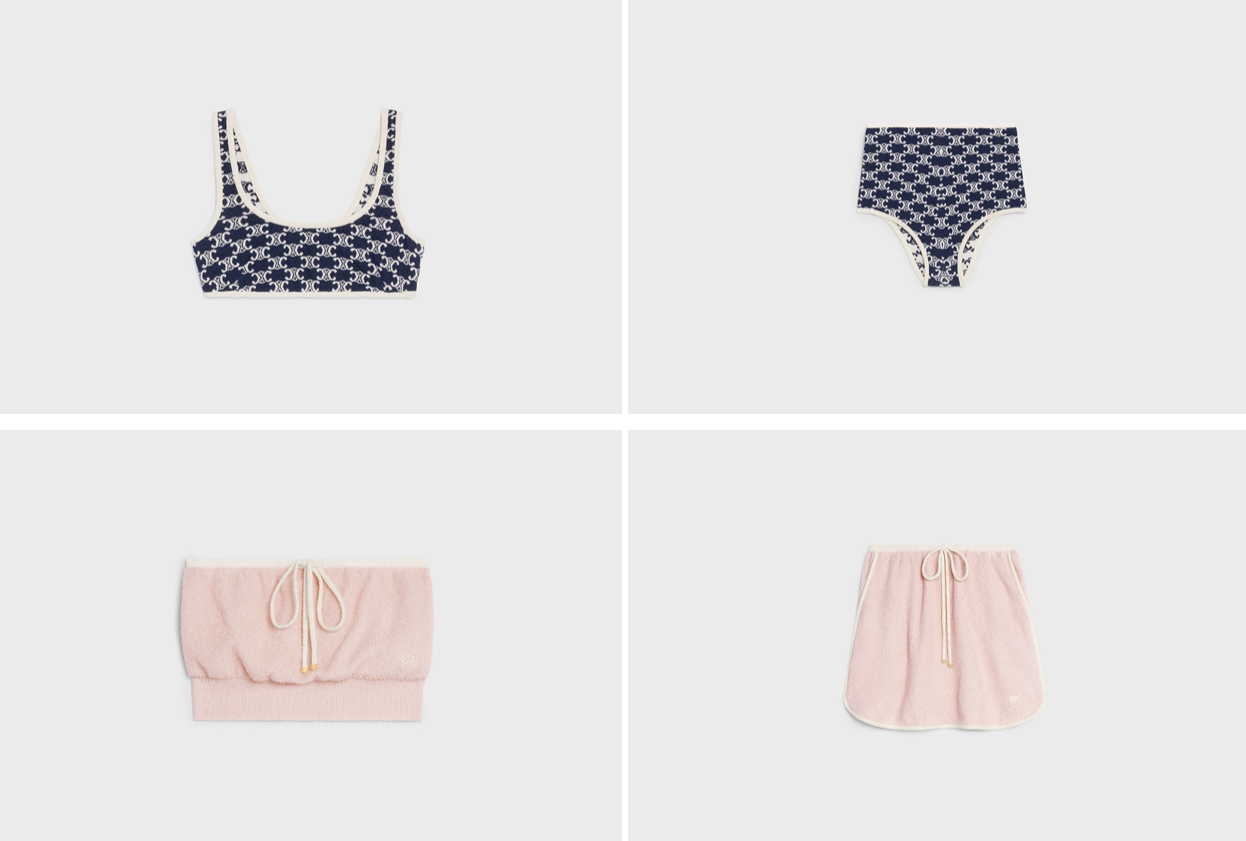 此外,该系列在大气简约的基调下,还蕴藏着许多提升单品质感的小细节设计,比如条纹比基尼上增添了金色链条元素,连体黑色泳衣的斜肩楼空剪裁,凉鞋以及包袋都延续了本季Celine主打的编织材质…,而且花纹和配色上也做了改良,整体呈现出全新精致面貌。