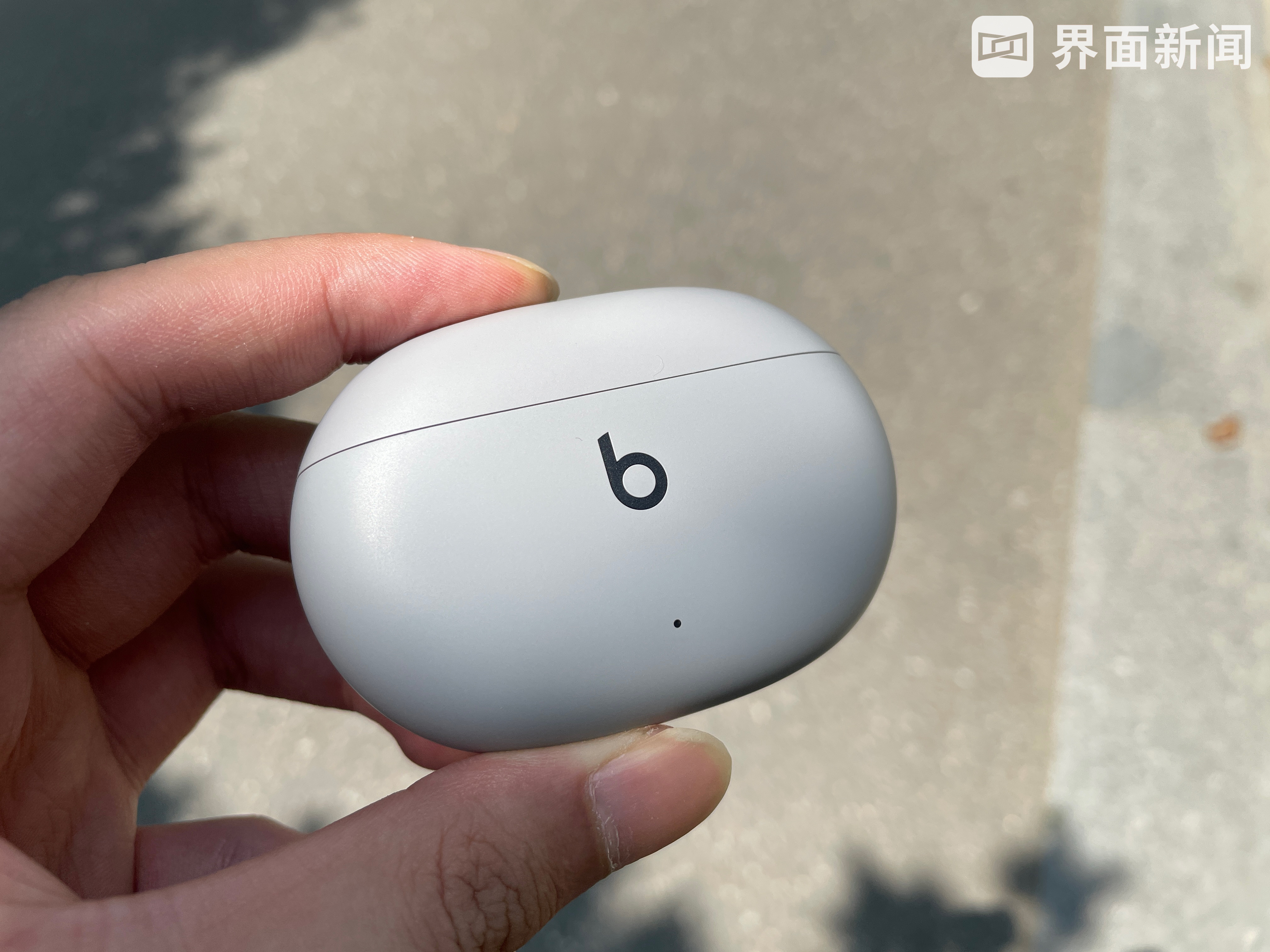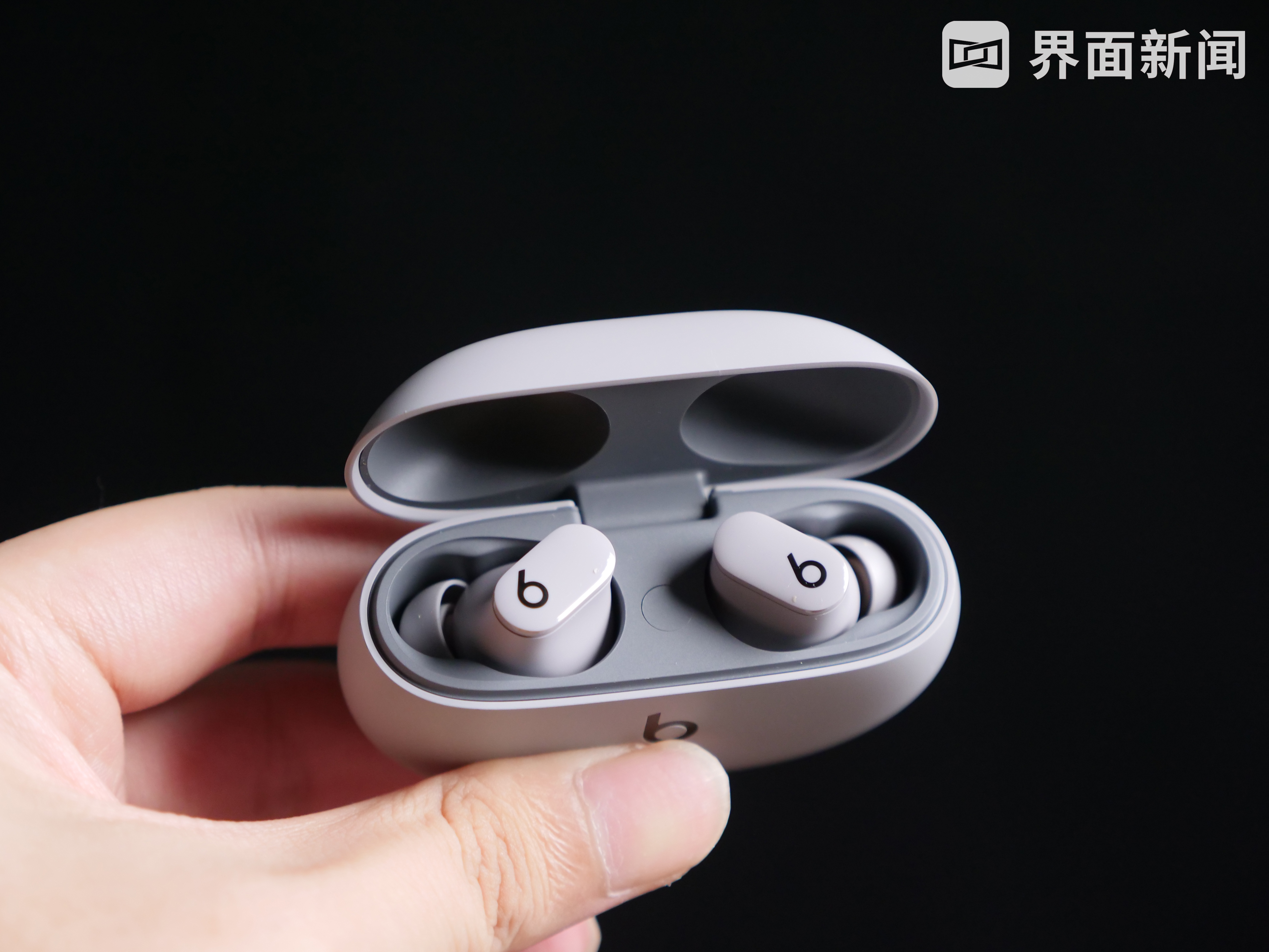 我手上的版本,是Beats Studio Buds新增的“月岩灰”配色,由于采用了“无柄”设计,Beats Studio Buds的耳塞体积缩小不少,印有“Beats”logo的一侧,则会有圆润的过渡来保证拿取的方便,整体看起来非常轻巧。