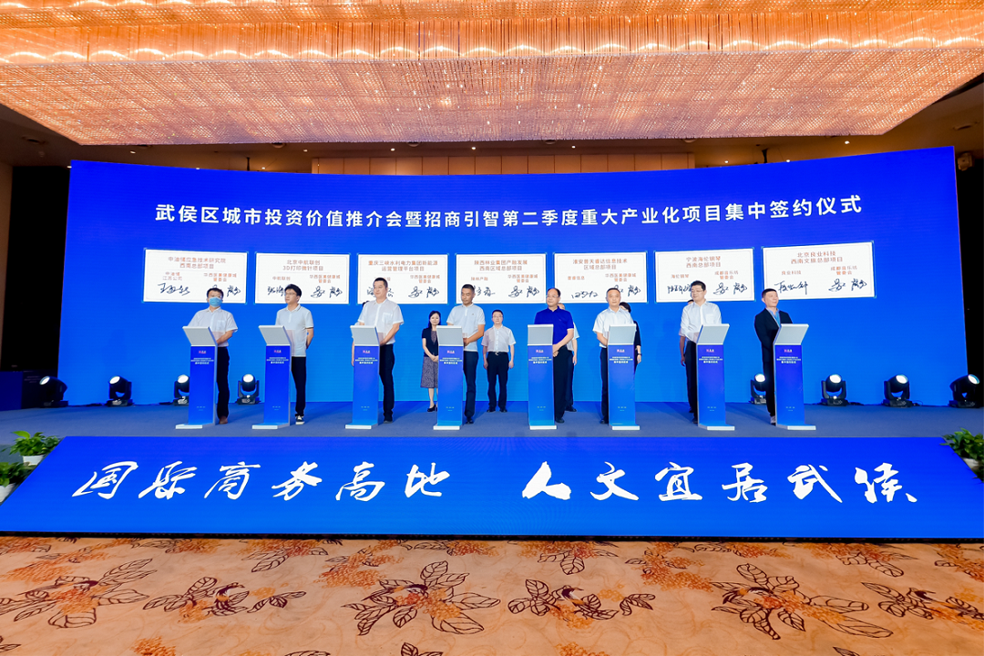 为深入贯彻落实市委、市政府建圈强链战略,展示武侯最佳国际化营商环境,促进项目加快落地,2022年6月16日,由成都市投资促进局,成都市武侯区人民政府主办的“武侯区城市投资价值推介会暨招商引智第二季度重大产业化项目集中签约仪式”顺利举行。通过线上线下相结合的方式,分享推介武侯发展机遇,集中呈现招商引智成果。