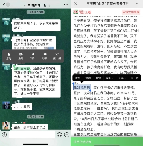 据界面新闻记者观察,这些筹款推广链接常常出现在具有社群性质的微信群及QQ群里,每次转发均使用大致雷同的话术,不少转发语还出现求助者与筹款者姓名不符的低级漏洞。