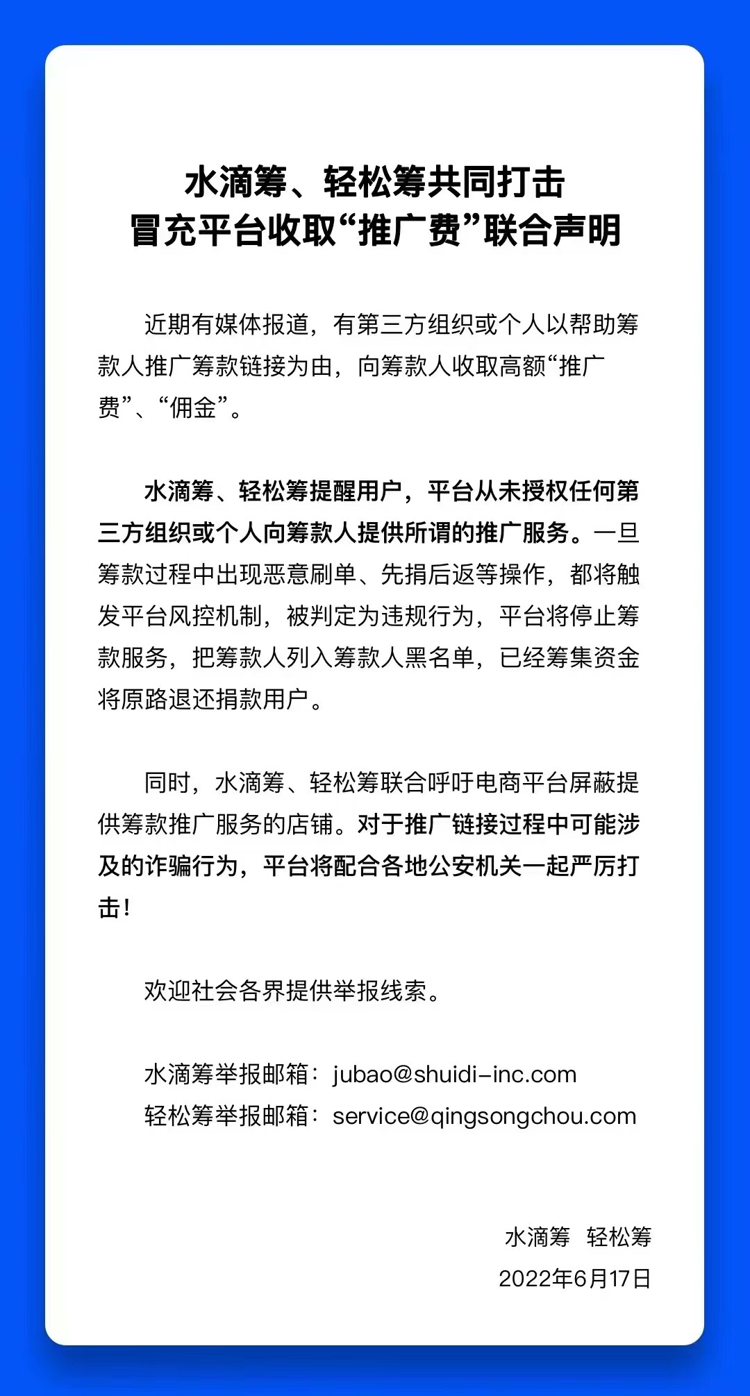 6月17日消息,针对不法分子冒充平台收取“推广费”的行为,轻松筹、水滴筹先后发布联合声明称,警惕第三方组织或个人以帮助筹款人推广筹款链接为由,向筹款人收取“推广费”、“佣金”。