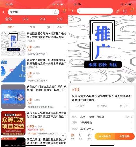 同时,轻松筹、水滴筹还联合呼吁电商平台屏蔽提供筹款推广服务的店铺。界面新闻记者经搜索发现,目前在淘宝平台上,仍有名为“心灵爱心推广”的店铺,挂出了各大筹款平台链接转发及推广的服务。