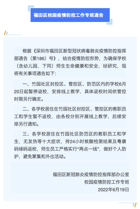 6月19日,深圳市福田区校园疫情防控工作专班发布通告:根据《深圳市福田区新型冠状病毒肺炎疫情防控指挥部通告(第186)号》,结合疫情防控形势,为确保学校(含幼儿园,下同)师生生命健康和安全,经研究,现将有关事项通告如下: