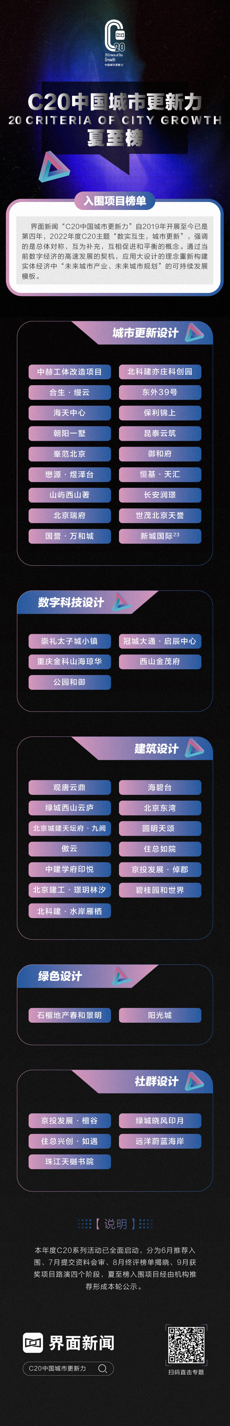 界面新闻“C20中国城市更新力”自2019年开展至今已是第四年,2022年度C20主题“数实互生,城市更新”,强调的是总体对称,互为补充,互相促进和平衡的概念。