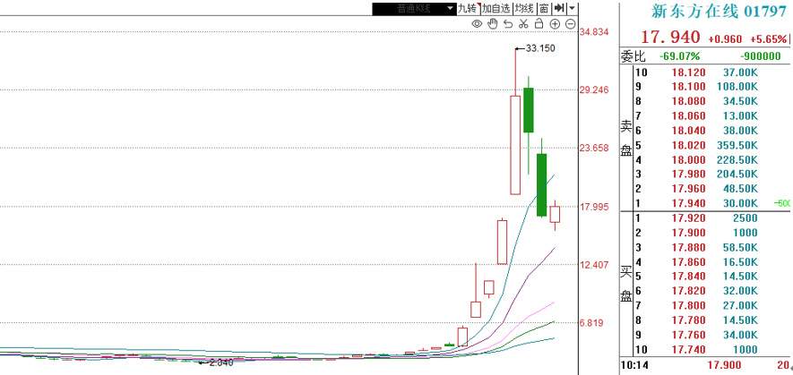 5天抹平过去一年跌幅,市值暴涨超300亿港元,成交金额近200亿港元。而在一个月之前,新东方在线的月成交金额只有4.15亿港元,天壤之别。